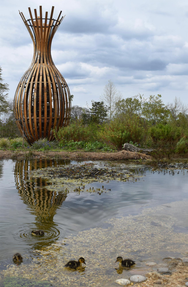 Our design is based on a bee’s wing and the intricate shapes within. The garden has been designed to provide a range of habitats, with large pools for aquatic creatures and pollinator-friendly planting. Areas showcasing different growing conditions (from dry shade to bog garden) are planted with brightly coloured flowers, mixing native with non-native species to offer the longest possible season of pollen, nectar and fruit. Log piles, a green roof and a bespoke sculptural sweet chestnut habitat tower by Tom Hare all demonstrate ways of encouraging wildlife to take up residence in your garden. Gravel beaches lead down to the edge of the wildlife pools allow children to pond dip, while long fingers of marginal and aquatic planting provide food and shelter to visiting wildlife. We were thrilled to find that the first ducks arrived to take up residence long before the diggers had departed.